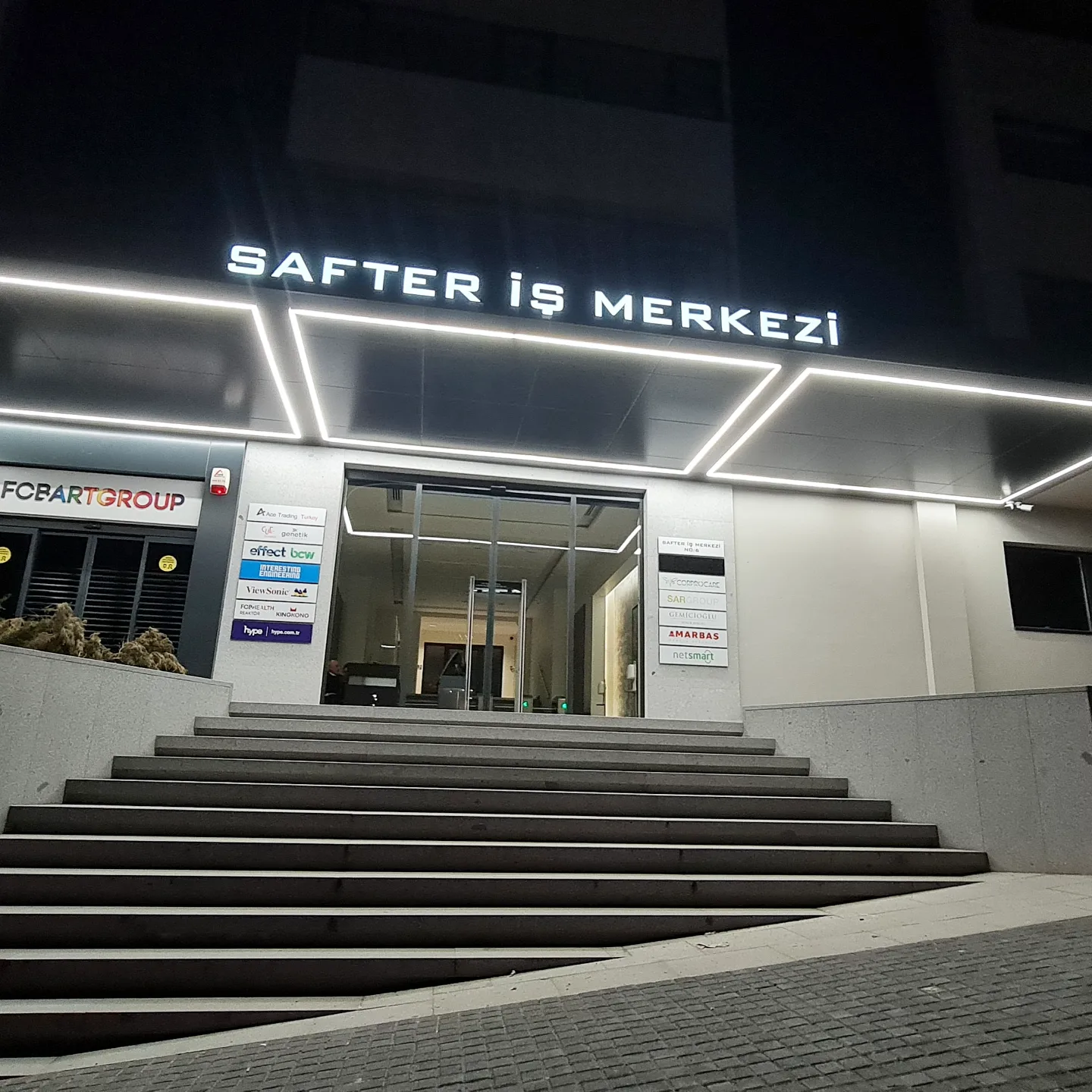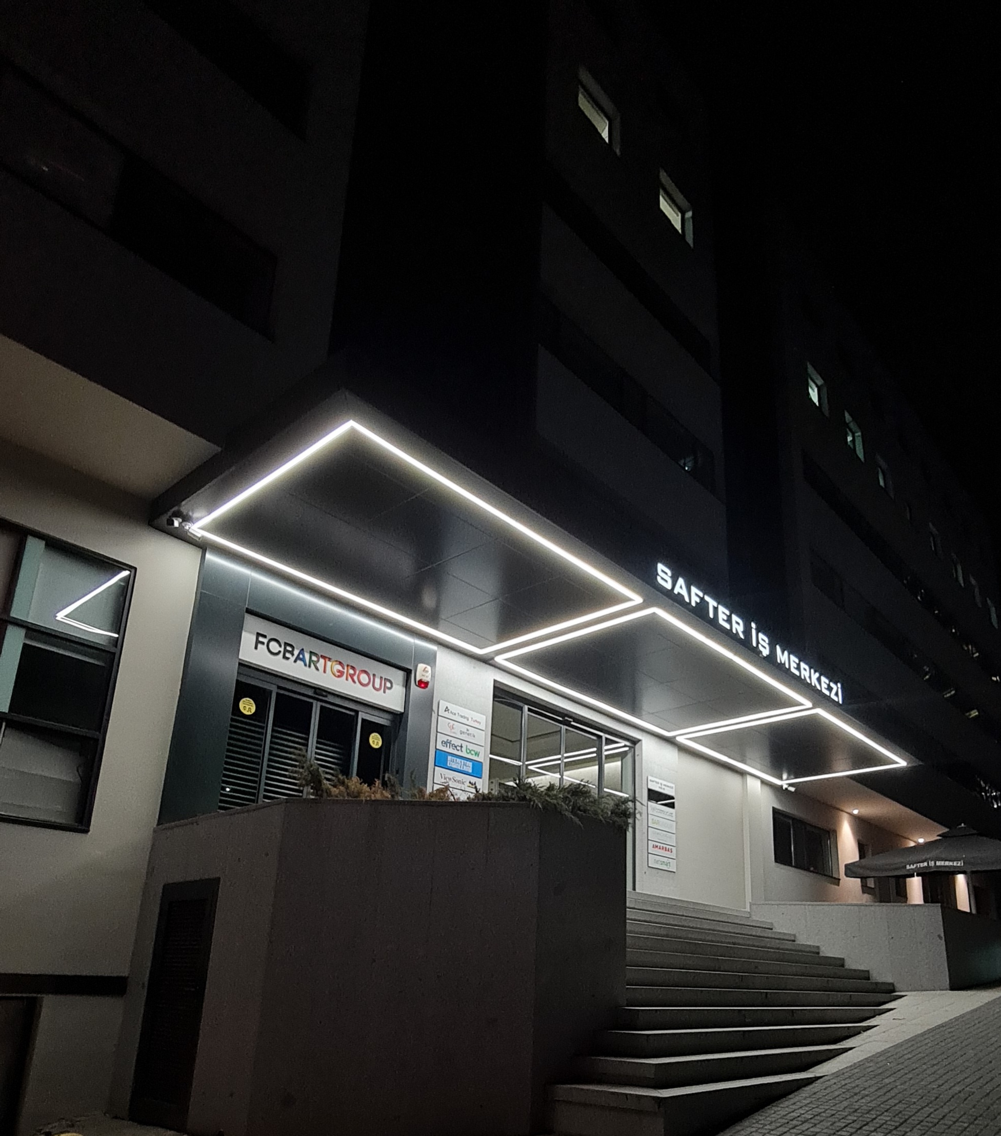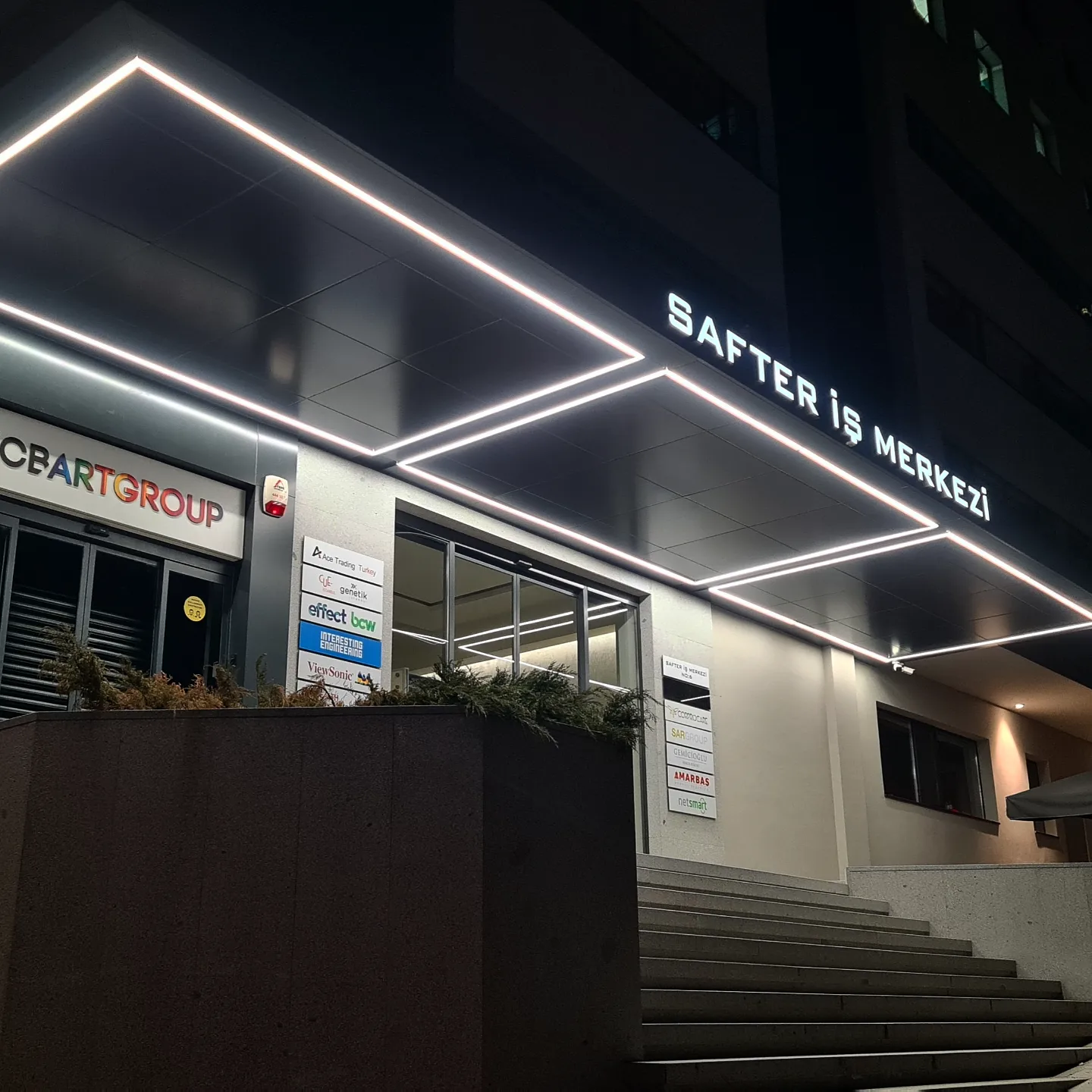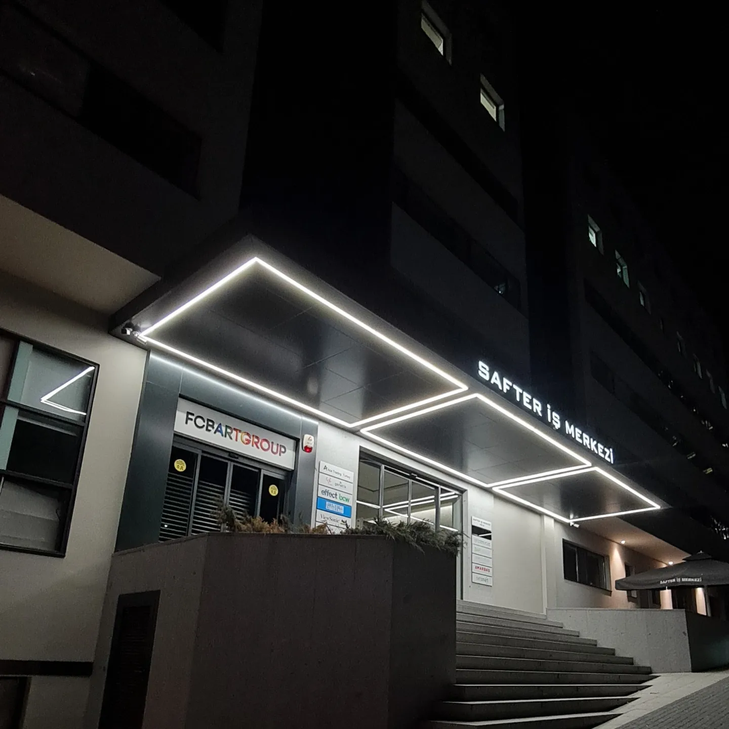 İş merkezinin modern ve profesyonel kimliğini güçlendirmek amacıyla, giriş saçaklarında ve cephede keskin hatlı lineer LED aydınlatma çözümlerini uyguladık. Bu çözüm, binanın gece görünürlüğünü ve kurumsal prestijini maksimum seviyeye taşıdı.